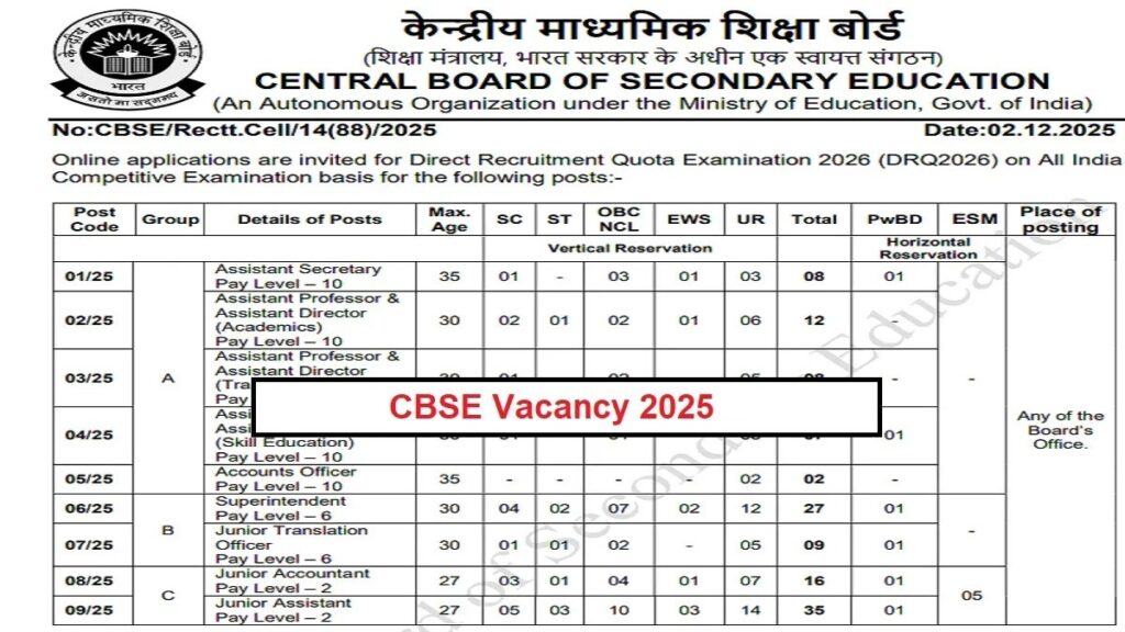 CBSE Recruitment 2025: सीबीएसई ने ग्रुप A, B व C के तहत कई पदों पर निकाली भर्ती, इस डेट तक ऑनलाइन कर सकते हैं अप्लाई